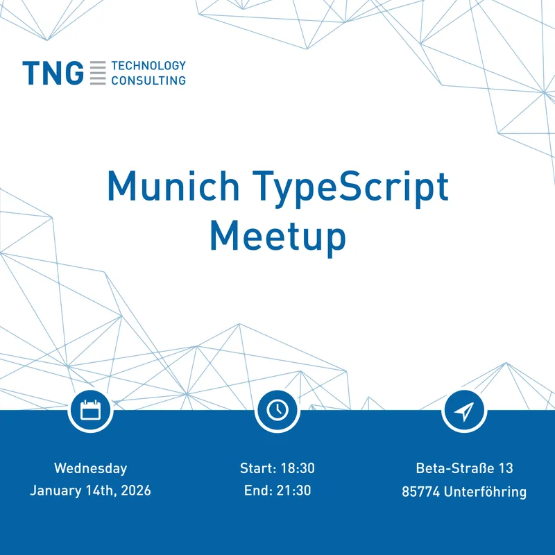 To kick off the new year, we will be hosting another Munich TypeScript Meetup at our office in Unterföhring on January 14th, 2026. Under the title “Advanced TypeScript: A deep dive into TypeScript's (sometimes intimidating) magic” our TNG colleagues will be sharing their knowledge on TypeScript together with Carl Assmann from the Bundeswehr. There will also be plenty of time for Q&A sessions, discussions, and networking. We will also exhibit a small selection of our AI showcases. Further information about the meetup can be found here.