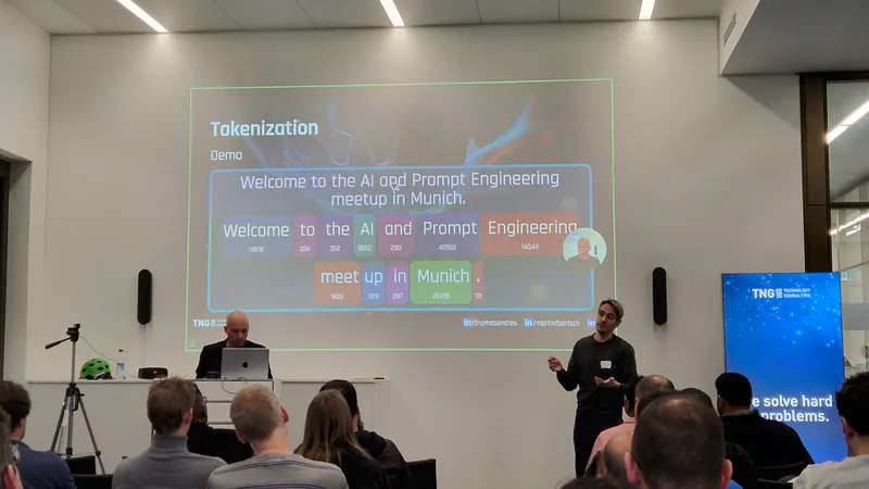 At our recent third AI & Prompt Engineering Meetup, we welcomed 60 guests to our Munich office for an evening full of experiments with Generative AI. In a special edition of their talk “AI'll Be Back: Generative AI in Image, Audio, and Video Production”, Martin Förtsch and Thomas Endres uncovered the inner workings of various AI tools, such as ChatGPT, Midjourney, Suno, and RunwayML. Together with the audience, we wrote lyrics and music for a song, designed artwork for an album cover, and even animated images for a music video in fun live demonstrations. In addition, the attendees could also try out AI showcases from the Innovation Hacking team and the Unitree G1 robot G1PO.