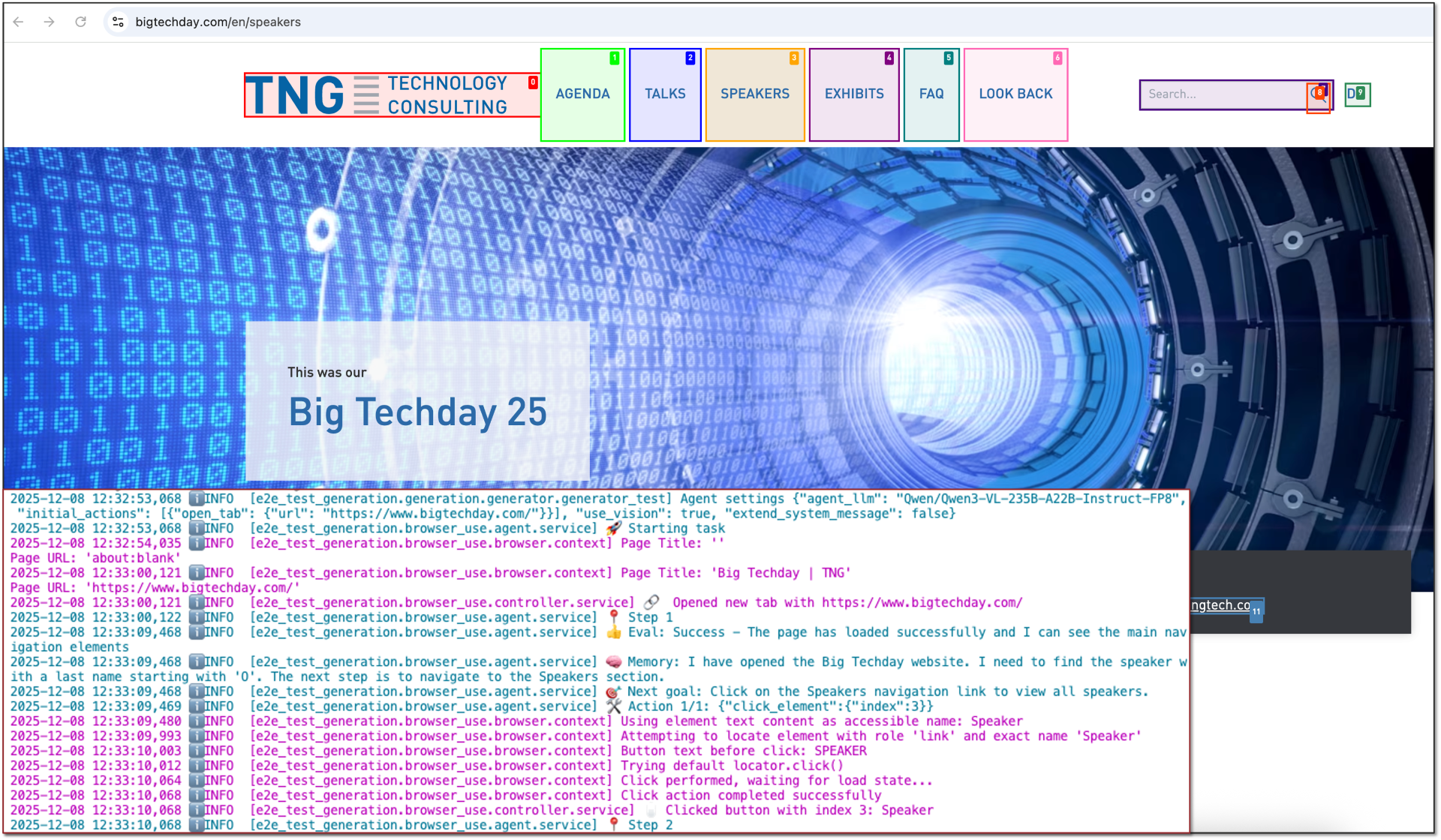 The screenshot shows a segment of an end-to-end test generation run with TNG AI E2E TestGen. In this scenario, the task is to find a specific speaker on the TNG Big Techday website. The agent has successfully loaded the homepage and clicked the “Speaker” navigation entry to open the speaker section. To achieve this, it combines DOM information with visual input from Playwright: it uses the rendered page to identify and colorize clickable UI elements and maps them back to their corresponding HTML elements in the DOM, enabling robust, visually guided interaction with the application.