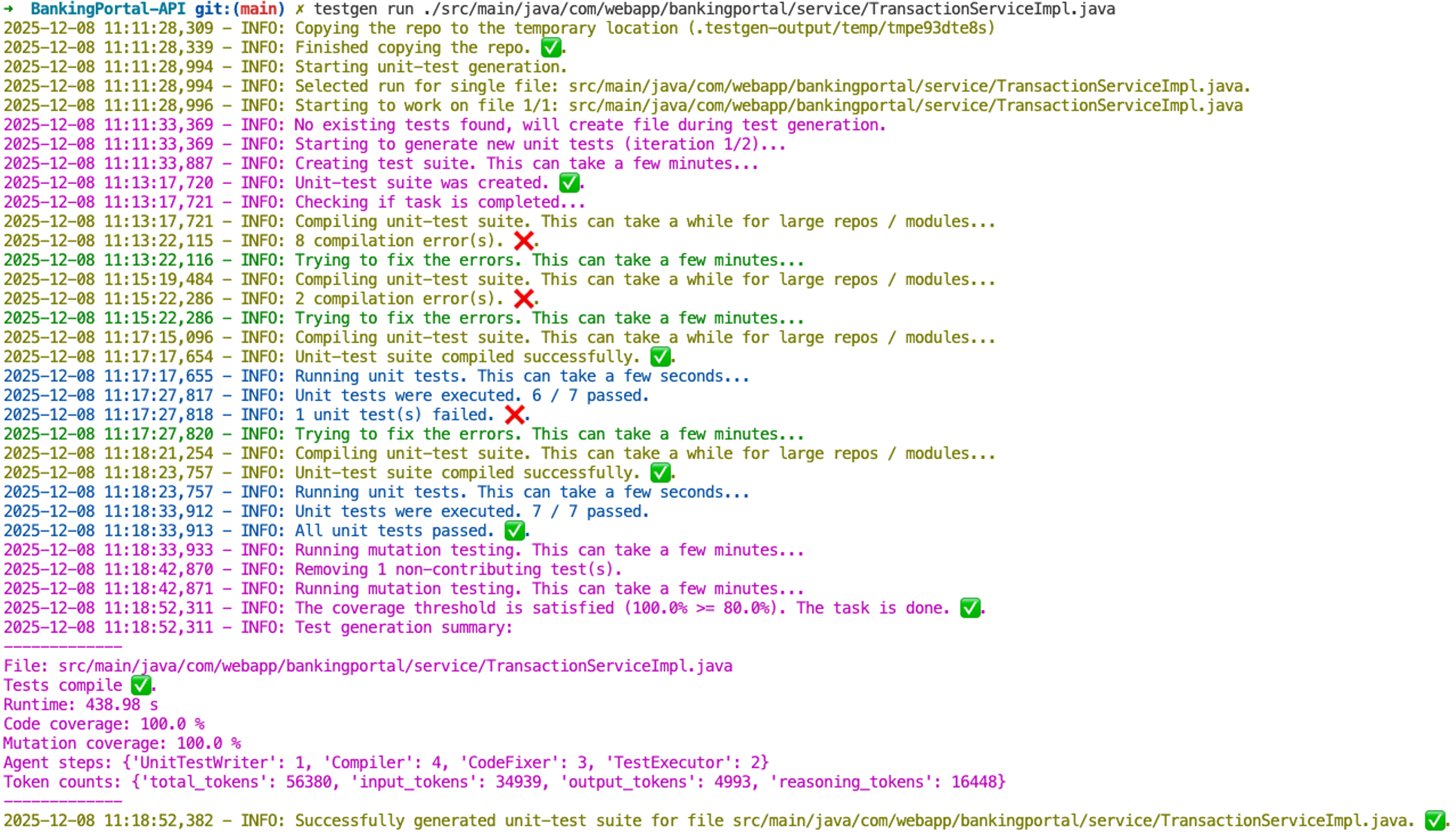 Folgende Abbildung zeigt einen typischen CLI-Workflow zur Generierung einer Unit-Test-Suite mit TNG AI UnitTestGen. Der Prozess beginnt damit, das Repository in ein temporäres Verzeichnis zu kopieren, um sicherzustellen, dass die ursprüngliche Codebasis während der Generierung nicht verändert wird. Anschließend wird die angegebene Datei aufgerufen, auf vorhandene Tests überprüft und – da keine gefunden werden – eine neue Test-Suite von Grund auf erstellt. Die erste Version der Suite lässt sich nicht kompilieren, daher führt TNG AI UnitTestGen mehrere Korrektur- und Kompilierungszyklen durch, bis alle Kompilierungsfehler behoben sind. Daraufhin werden die Tests ausgeführt, eventuelle fehlschlagende Tests erkannt und ein zusätzlicher Debugging-Zyklus ausgeführt, bis alle Tests erfolgreich sind. Im Anschluss werden Mutationstests durchgeführt. Nicht beitragende Tests (d.h. solche, die die Mutationsabdeckung nicht verbessern) werden entfernt und die Mutationstests erneut durchgeführt. Da die resultierende Mutationsabdeckung den konfigurierten Schwellenwert von 80 % überschreitet, wird der Durchlauf als erfolgreich betrachtet, und die generierten Tests werden in die ursprüngliche Codebasis transferiert.