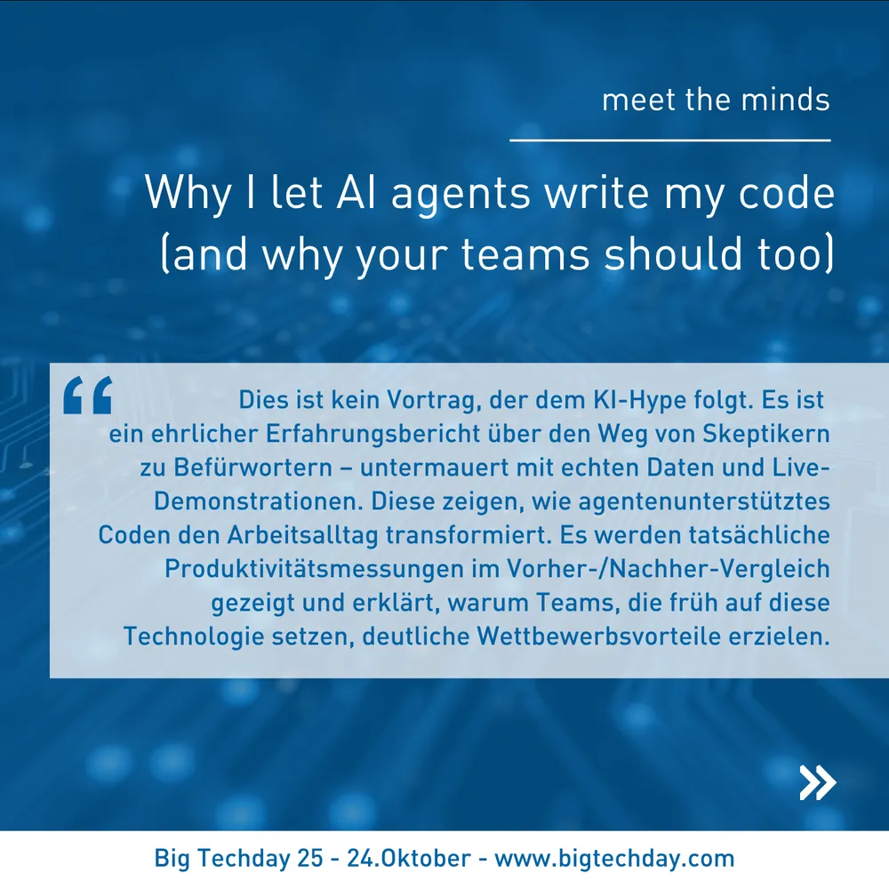 Wie können KI-Agenten die Softwareentwicklung verändern? Michael Joos von Flour sowie Luca Becker und Sajjad Ahmad von TNG Technology Consulting werden einen Vortrag zum Thema "Why I let AI agents write my code (and why your teams should too)" halten. Sie berichten über ihren Weg von Skeptikern zu Befürwortern, mit realen Vorher/Nachher-Produktivitätsmessungen und Live-Demonstrationen agentengestützter Programmierung.