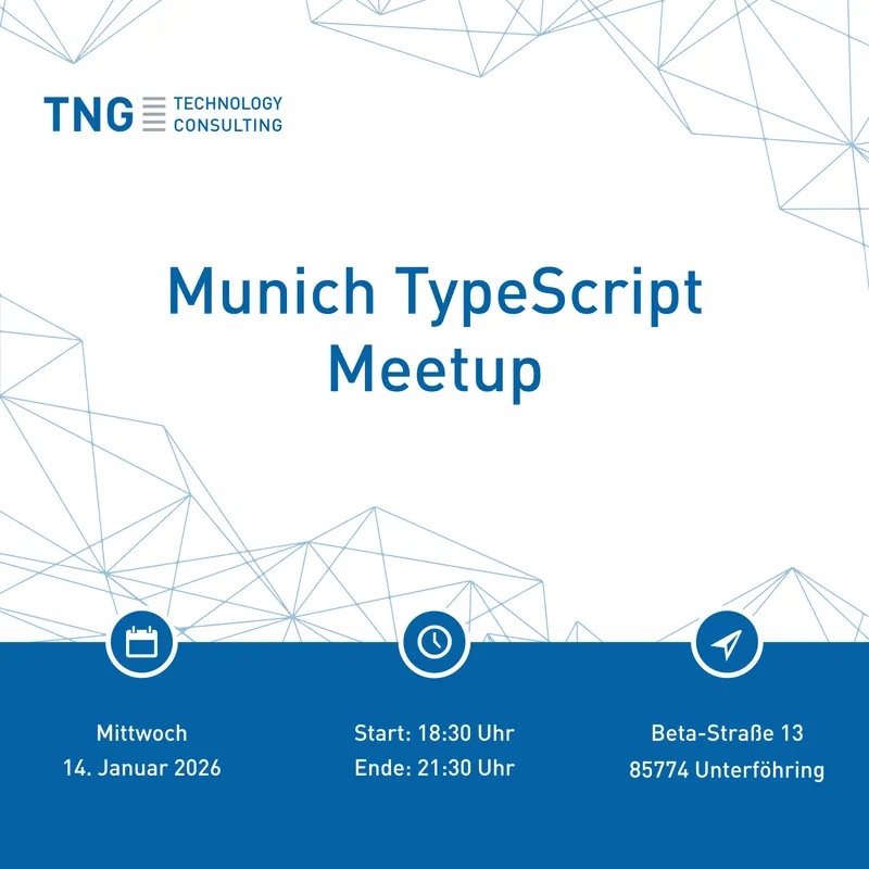 Zum Start ins neue Jahr findet am 14. Januar 2026 in unserem Büro in Unterföhring eine Ausgabe des Munich TypeScript Meetups statt. Unter dem Titel "Advanced TypeScript: A deep dive into TypeScript's (sometimes intimidating) magic" werden unsere TNG-Kollegen gemeinsam mit Carl Assmann von der Bundeswehr ihr Wissen zu TypeScript teilen. Auch für Q&A Sessions, Diskussionen und Networking wird ausreichend Zeit sein. Außerdem stellen wir eine kleine Auswahl unserer KI-Showcases aus. Weitere Informationen zum Meetup gibt es hier.