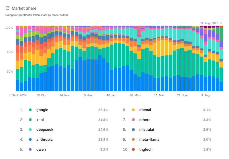 An diesem Sonntag erreichten die beiden LLMs R1T und R1T2 Chimera von TNG, die in Deutschland aus DeepSeek-Komponenten hergestellt wurden, zusammen die Top 10 auf OpenRouter, dem weltweit größten LLM-Aggregator. Sie erzielten einen Spitzenwert von 9,42 Milliarden Token pro Tag, was 1,8 % des Gesamtdurchsatzes von OpenRouter entspricht.